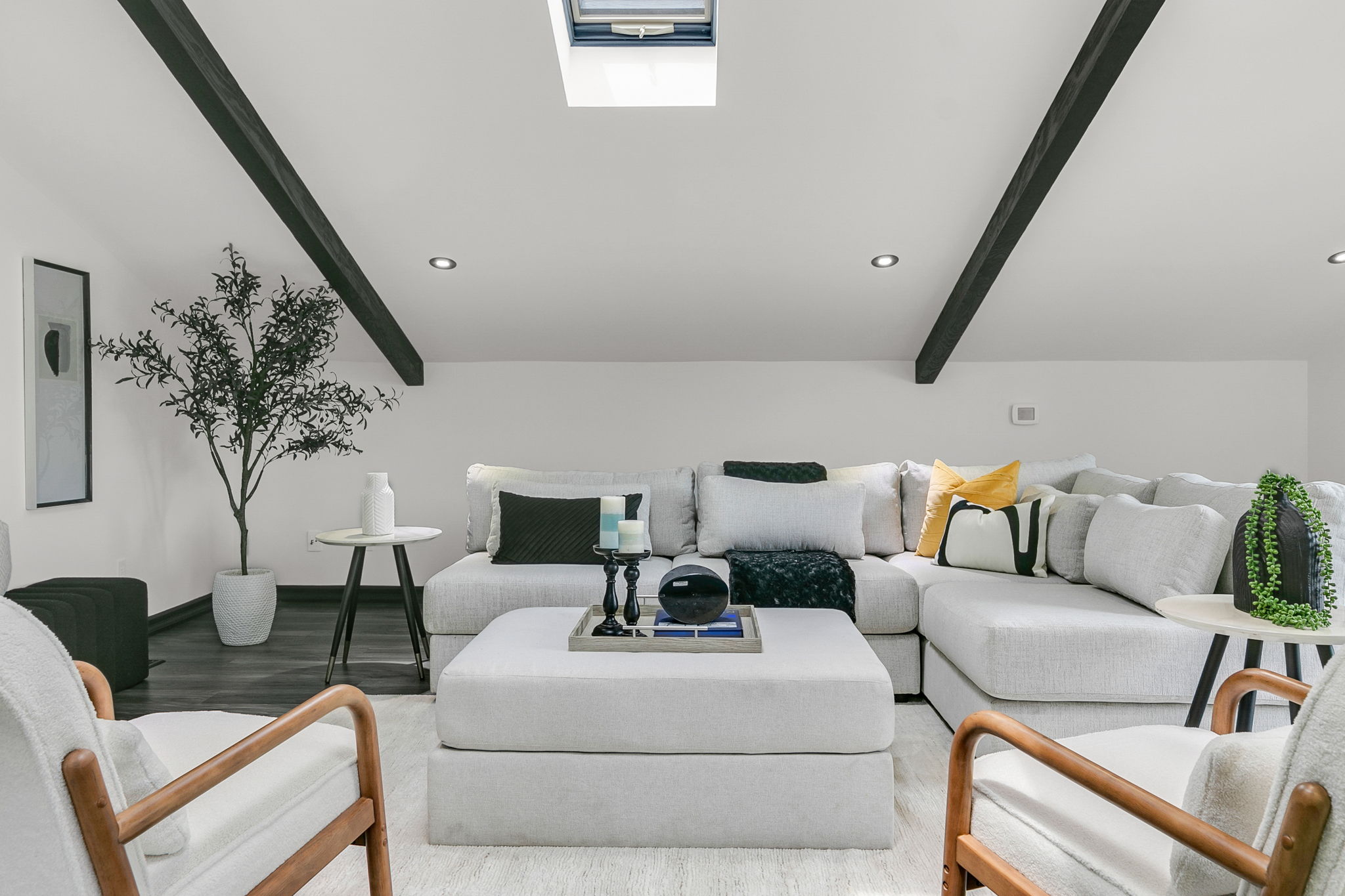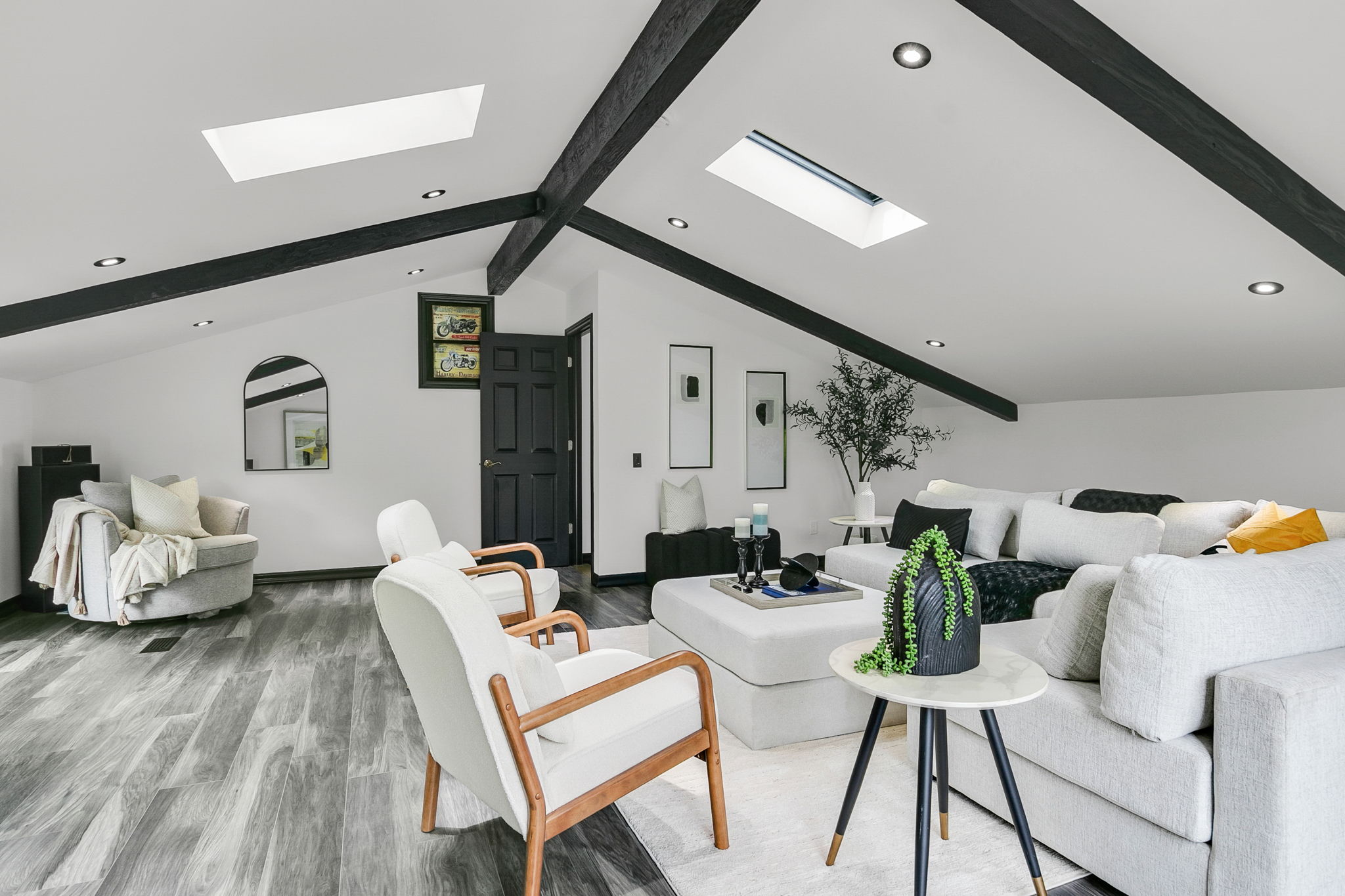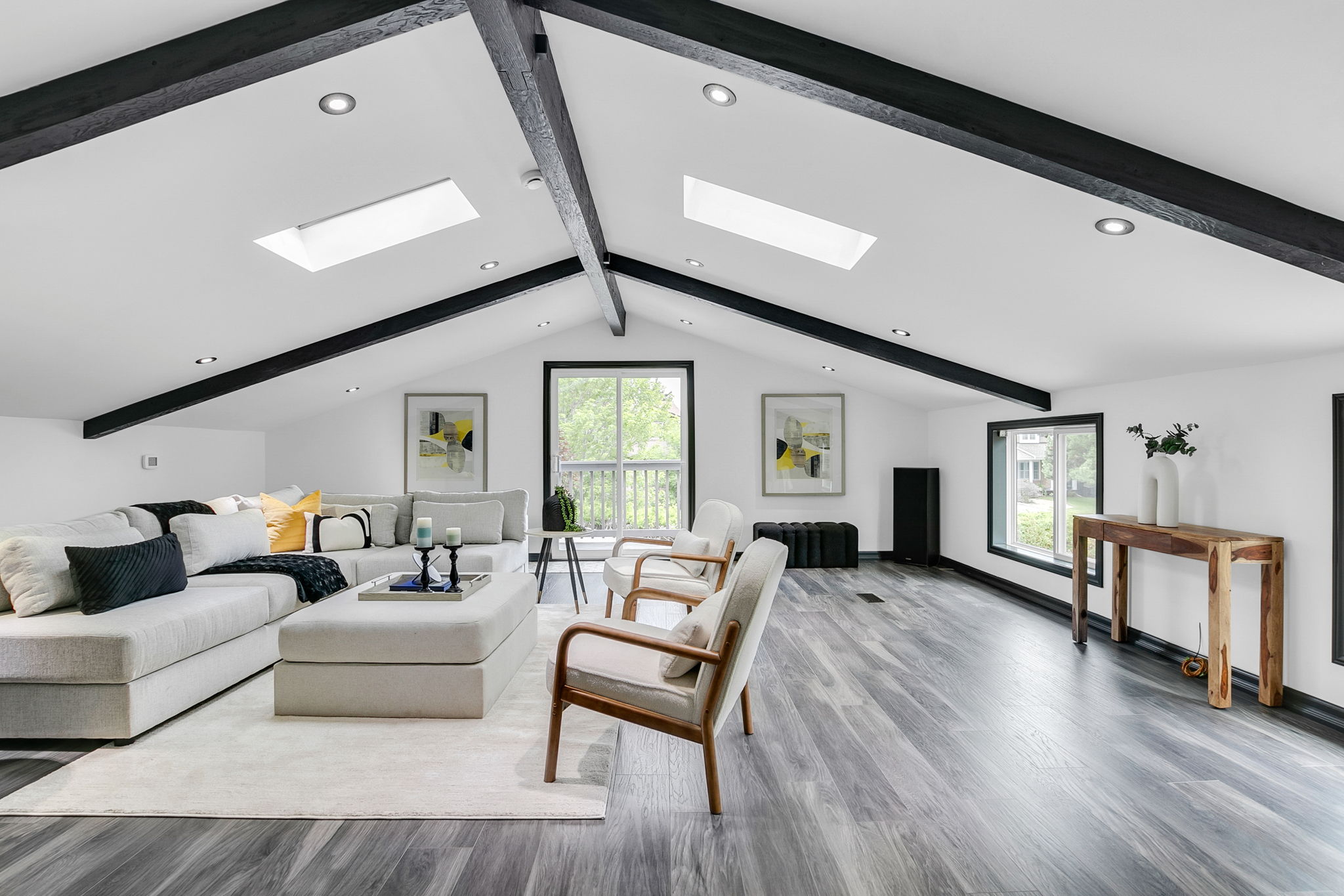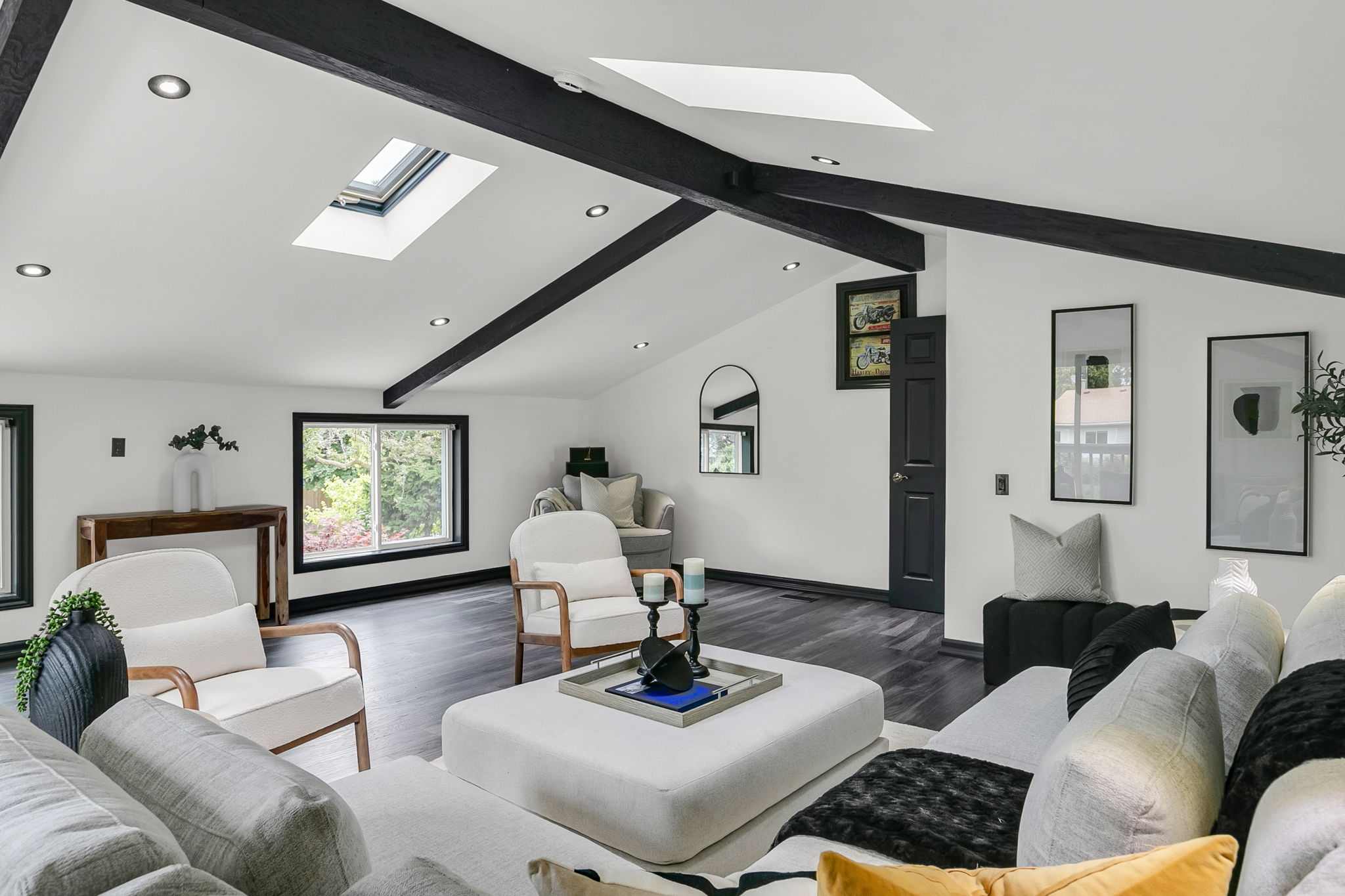A standout feature is the spacious bonus family room above the garage, complete with vaulted ceilings, skylights and wood beam accents—ideal for a media room, playroom, bedroom suite or lounge.